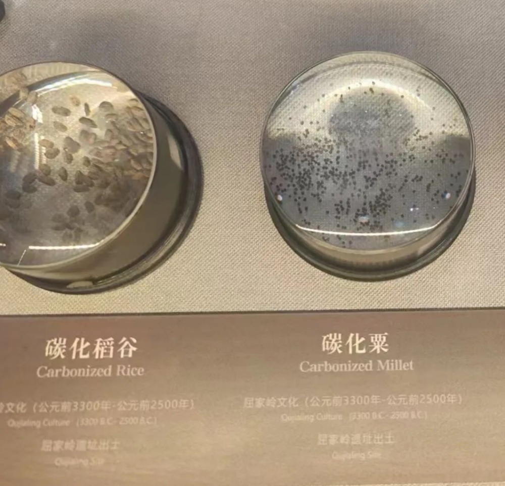 此次展览中展示了屈家岭遗址博物馆馆藏的碳化稻、碳化粟、磨光黑陶碗等5件(组)典型文物。屈家岭遗址作为长江中游地区发现最早、最具代表性的新石器时代大型聚落遗址,其出土的碳化稻和黑陶堪称文明瑰宝。