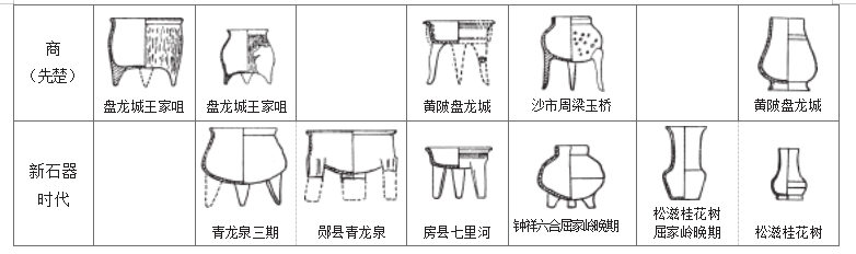由夏商之际而上溯,遍寻江汉地区的新石器时代文化遗存,在继屈家岭文化之后发展起来的相当于龙山文化时期的石家河文化中,基本不见鬲类陶器。而在中原地区新石器时代的龙山文化晚期遗存中,却已经可以见到日用炊器的陶鬲。如在陕西客省庄晚期龙山文化中,即广泛以陶鬲为炊器。在河南境内,除豫南外,豫北的后冈、大赉店,豫中的牛砦、旮旯王,以及豫东的永城造律台和豫西的洛阳王湾、陕县三里桥等,各个遗址的晚期龙山文化遗存中都出有鬲类炊器。山西西南部的陶寺晚期龙山文化遗存的炊器中亦有陶鬲。可见鬲类炊器,本源于中原地区[12]。江汉流域的陶鬲,最先在鄂东北区域内的夏商之际文化遗存中初现端倪,说明它和中原文化必有关系。