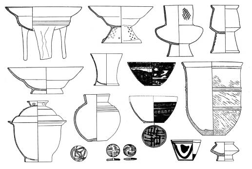 屈家岭文化早期以泥质黑陶为主,泥质灰陶和泥质红陶次之,其中有极少的夹砂陶。器表以素面为主,纹饰陶很少,主要有弦纹、镂孔、少量附加堆纹,极少彩陶和朱绘陶。彩纹有条纹、横带纹、网格纹等,分别饰于杯、碗和壶形器上。主要器形有鼎、甑、碗、杯、盘、簋、盆、盂形器、罐、器盖和器座等。屈家岭文化早期的罐形、釜形鼎,亦均为小型,已不见红陶小鼎,出现不少带盖黑陶鼎。新出现的器形有簋形、豆形、罐形甑,有领弧腹小平底罐,橙黄和橙红陶斜腹小杯、斜腹彩陶杯(橙红地、黑带彩饰于杯口沿内周壁)、高圈足杯、曲腹杯、斜弧腹碗、双腹碗(或双腹豆)、三个角形纽器盖和彩陶纺轮等(图5)。这类黑陶文化遗存,虽继承了不少油子岭文化因素,但它的陶系已起了显著变化,其陶器群内出现的大批新器形,多为屈家岭文化的典型器,故有学者亦将其称之为油子岭文化发展至屈家岭文化的过渡期文化遗存。