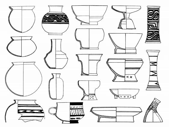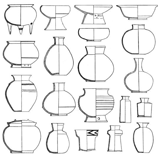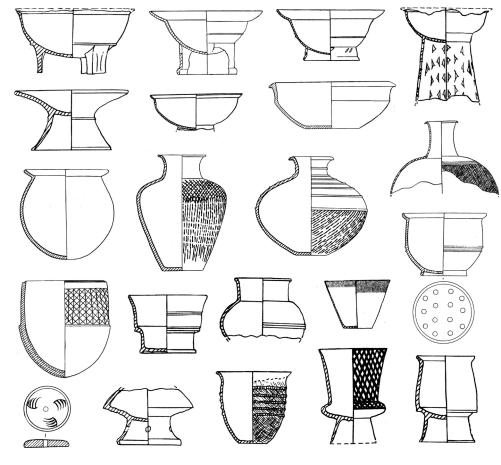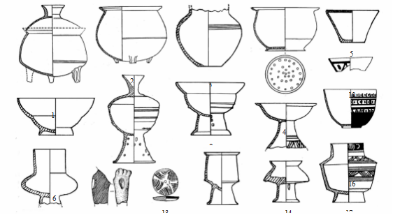 大溪文化以其器形中的釜、多式罐、曲腹杯、折敛口浅腹圈足盘、细颈壶、深腹豆、筒形瓶、有颈直壁瓶和支座等一组陶器群为其文化特色(图3)。