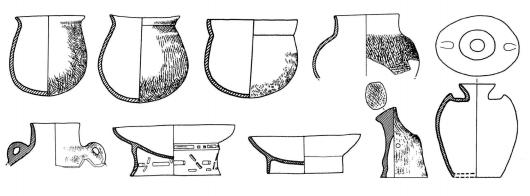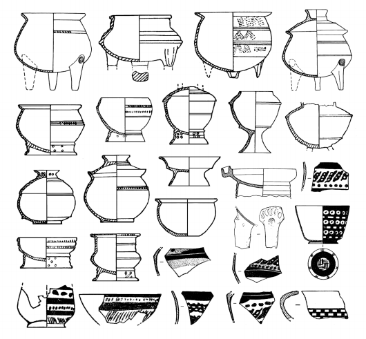 1.鼎 2.双腹豆 3.壶形器 4.高圈足杯 5.双腹碗 6.杯 7、13.蛋壳彩陶碗 8.甑 9.罐 10.陶球