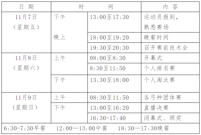 (四)报名运动员应身体健康,经常参加射箭训练比赛活动,熟悉射箭安全规则。